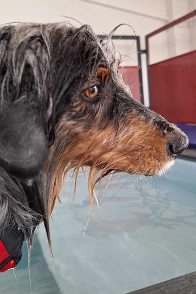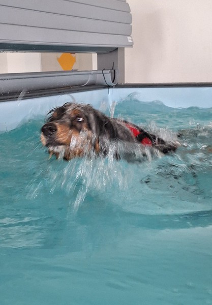 Umso begeisteter war ich, als im Nachbarort ein reines Hundeschwimmbad eröffnete, in der Tierphysio Fit und Vital. Seitdem versuchen wir einmal pro Monat dort zu schwimmen. Unter Anleitung, mit Rettungsweste und Frauchen als "Anker" im Wasser und am Beckenrand.